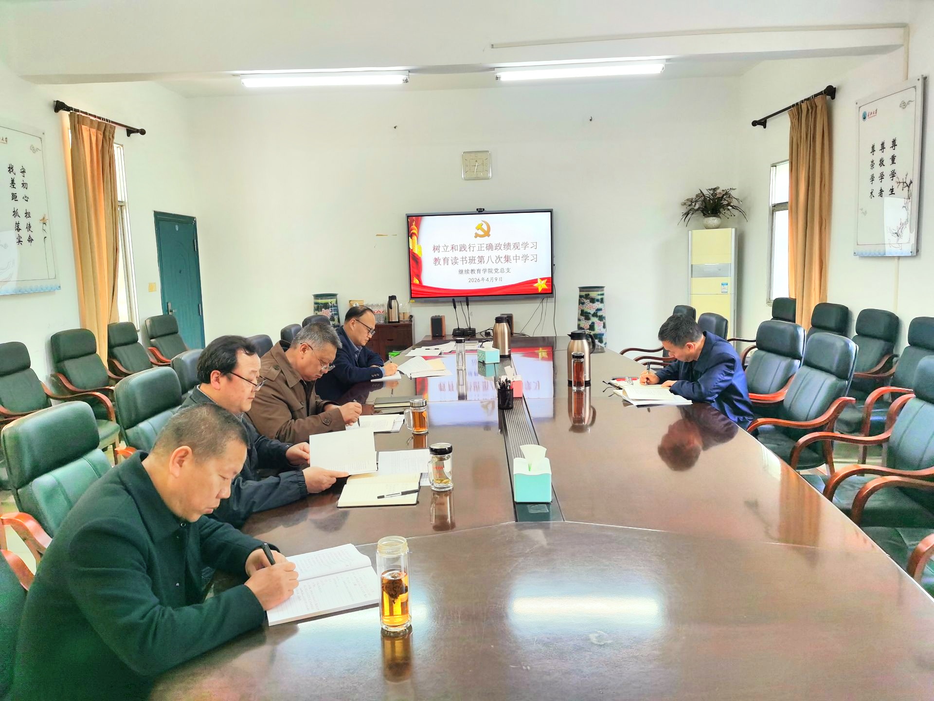4月9日下午,继续教育学院党总支举行树立和践行正确政绩观学习教育读书班第八次集中学习。院长、党总支书记蒋四华主持,读书班全体成员参加学习。
