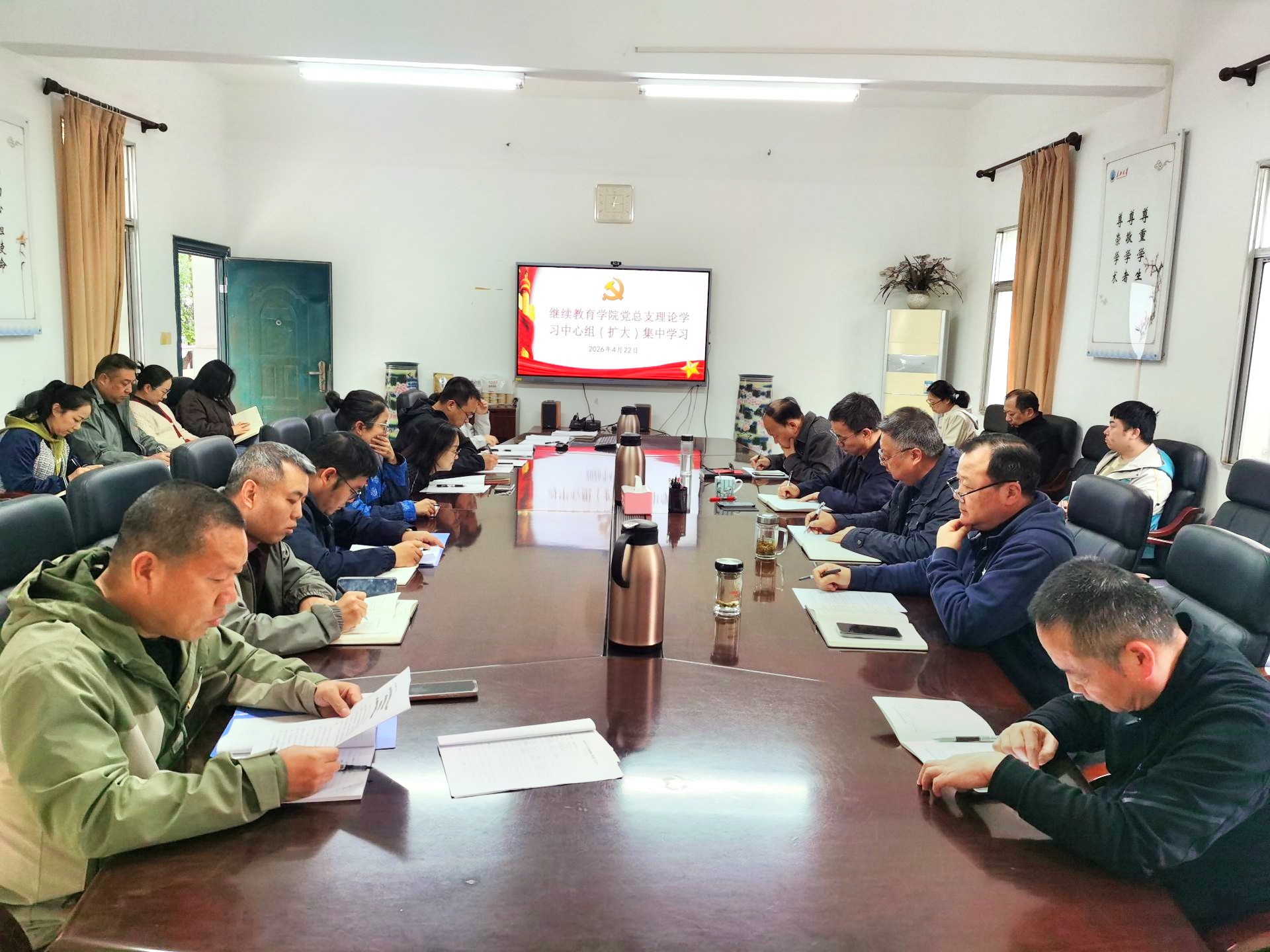 2026年4月22日下午,继续教育学院在207会议室开展4月份党总支理论学习中心组集中学习扩大会暨教职工党支部主题党日活动,全体教职工参加会议。会议由院长、党总支书记蒋四华同志主持。